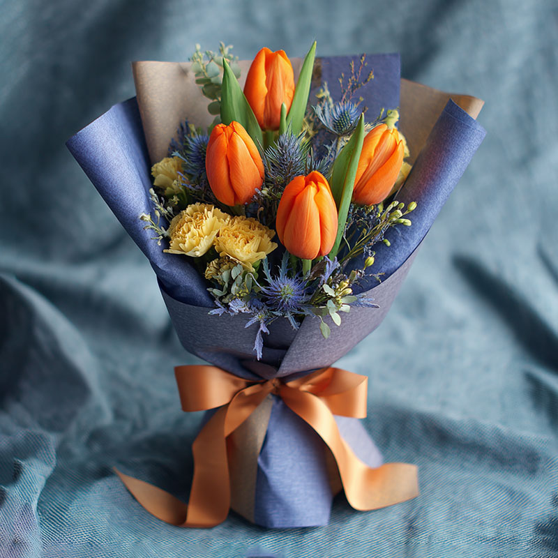這束花,如同黎明將啟前的火光,從沉寂中悄然燃起。橙色鬱金香是晨曦的使者,挺立在藍紫與金黃的交織之間,彷彿訴說著希望與堅韌的詩篇。藍色海葵刺如靜夜星辰,冷冽而沉穩,對比出鬱金香的溫暖與生命力;淡黃康乃馨柔和其中,如舊信紙上的溫言軟語。深藍與古銅的紙張包裹著這份力量與溫柔,絲帶一束,像將熱情與靜謐緊緊繫在心上。