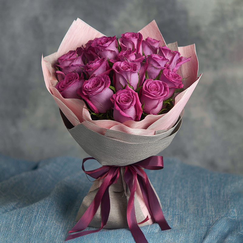 這束花是暮色與晨光的邂逅,紫玫瑰如晚霞浸染的綢緞,每一片花瓣都流淌著夢幻的流光。淺粉內襯似少女的羞赧,灰藍包裝紙如黎明前的薄霧,輕輕裹住這份「紫韻幽情」。酒紅絲帶繫成優雅的結,在藍色綢布上投下溫柔的影,彷彿將天際最後一抹霞光都封存在這捧「暮色私語」裡。