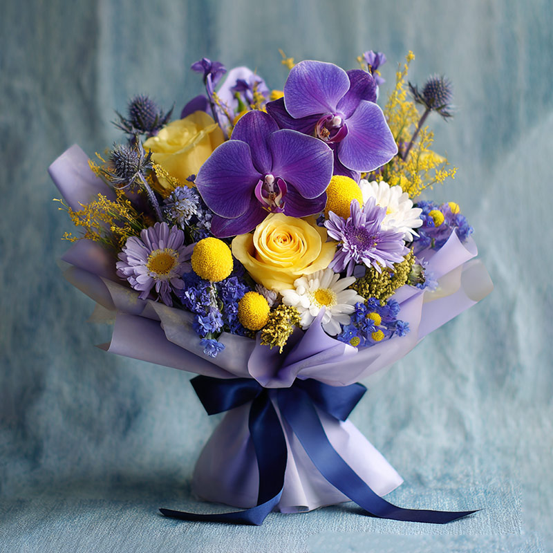 這束花是陽光與星夜的私語,黃玫瑰如晨曦凝成的琥珀,在紫色蝴蝶蘭的幽深中綻放溫暖。白雛菊似晨星灑落,紫洋甘菊若暮色輕染,黃球花則如散落的月光碎片。紫色包裝紙裹住這份「蝶舞流光」,深藍絲帶繫成優雅的結,在藍灰幕布前靜靜訴說「黃與紫」的絢爛詩篇。※ 商品陳列道具不包含在內。花材實際色調可能與圖片略有差異,若缺貨將以等值花材替換。