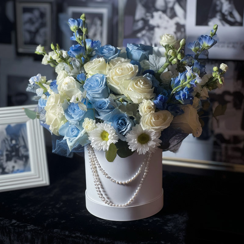 這束花是月光與海霧的私語,藍玫瑰如被晨露浸染的雲朵,米白玫瑰似月光凝成的薄紗。洋桔梗在花間流轉如深海漣漪,雛菊則似浪尖的碎鑽,在珍珠鏈的柔光裡輕輕搖曳。黑白相片牆前,這份「藍調夢境」被裝進純白圓筒,彷彿將整片靜謐的海灣都封存在這捧「雲海絮語」中。