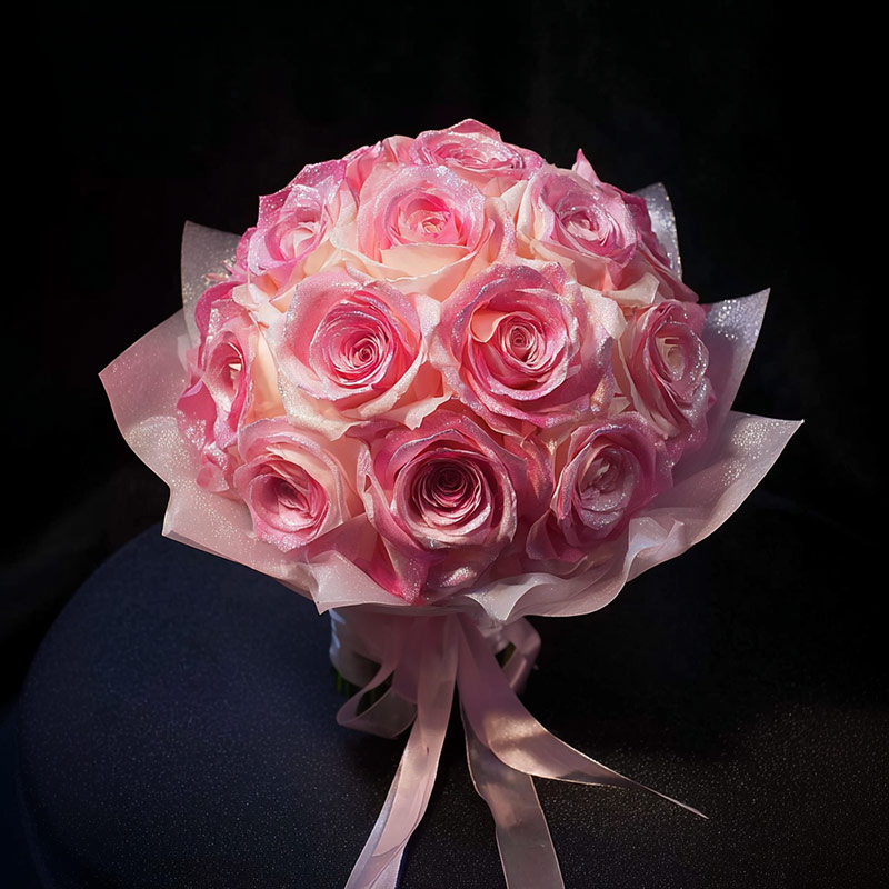 這束花是晨曦與雪光的私語,粉玫瑰如初綻的緋雲,每一片花瓣都鍍著銀霜般的光暈,在晨露中舒展著蜜糖色的溫柔。淺粉雪紡紗似薄霧輕攏,透出內裡如絲綢般的光澤,黑色背景將這份「緋雪凝光」襯得愈發空靈。絲質緞帶垂落如銀河傾瀉的弧線,在斜光中勾勒出朦朧的輪廓,彷彿將整個黎明的溫柔都封存在這捧「銀翼之吻」裡。